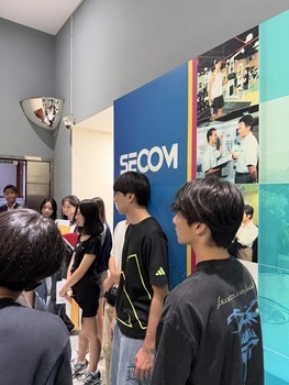 続けて、普段は入ることのできない貴重な施設を見学させていただきました。実際に使用されている種類豊富なカメラ機能の説明、厳重なセキュリティで守られた貸金庫、データ管理ルーム、そして24時間体制で社会の安全を見守るオペレーションセンターでは、社会インフラを支える現場の緊迫感を肌で感じているようでした。さらに技術開発部門では、最先端の機器開発の取り組みも伺い、生徒は真剣な眼差しで聞き入っていました。