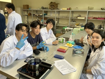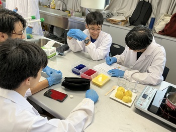その後、豆乳に異なる量のレモン果汁を加えて加熱し、どの条件で最もタンパク質が凝集しやすいかを検証する実験に挑戦。多くの班で予想とは異なる結果が得られ、その理由について科学的根拠をもとに議論する姿が見られました。仮説検証のプロセスを実体験したことで、生徒たちは科学的思考の面白さと奥深さを改めて理解することができました。
