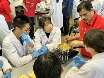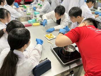 授業の冒頭では、TAのみなさんが自己紹介とともに、自身のこれまでの経験から「ユニークな食べ物」を紹介。生徒たちは、初めて耳にする食材や、一般的には食べ物として認識されない素材を用いた料理の話に大いに興味を引かれ、食の多様性と科学のつながりを実感していました。