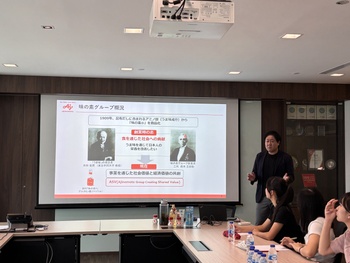 訪問では、五つの味覚の中で最後に発見された「うま味」について学び、みそ汁の試飲体験を通して、うま味が味にどのような違いを生み出すのかを体験しました。また、味の素グループが食品とヘルスケアを両軸に、アミノサイエンスを通じて人・社会・地球のWell-beingへの貢献を目指していることを知りました。