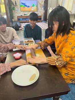 生徒たちは地元のホストファミリーに温かく迎えられ、伝統的なマレー衣装を着せてもらいました。また、マレー料理を味わい、右手だけを使って食べる伝統的な食事作法に挑戦しましたが、思った以上に難しく感じたようです。さらに、マレーの伝統的な遊びを楽しみ、カレーパフ作りにも挑戦しました。わずか3時間ほどの滞在でしたが、生徒たちはホストファミリーとの別れを惜しんでいました。