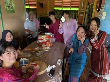 2日目は、ジョホール州郊外にあるアヤヒタム村でマレーシアの生活と文化を体験するホームビジットを行いました。訪問したご家庭で簡単な自己紹介を行い、準備していただいた民族衣装に着替え、マレースタイルの昼食をいただきました。右手のみでの食事に難しさを感じていましたが、普段とは違う味付けされたマレー料理を堪能しました。昼食後は、マレーシアの伝統的なゲーム「チョンカ」に挑戦したり、多くの方に親しまれている「カレーパフ」を作ったりと、様々な経験を積むことができました。