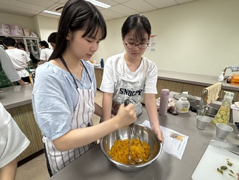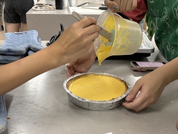 まず、パンプキンタルトを作る前に、ハロウィンの歴史について調べ学習を行いました。ハロウィンは、古代ケルト人の「サウィン祭」に由来し、秋の収穫を祝うとともに、霊的な世界とのつながりを意識する祭りでした。また、ジャック・オ・ランタンはアイルランドの昔話で、ジャックが悪魔を2度もだまし、死後彼は天国と地獄から受け入れを拒否され、天国と地獄のはざまを永久にさまようジャックに、悪魔が情けをかけ、かぼちゃのランタンと、明りを灯すための燃えさしを与えたことが起源ということを学びました。タルトを焼くのにかかる時間がとても長く、時間に追われながらの作業でしたが、かぼちゃの濃厚な味わいがとてもおいしいパンプキンタルトを作ることができました。