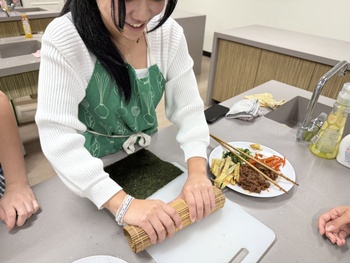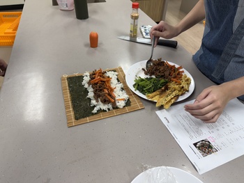 11月14日の活動では、韓国料理をテーマにキンパを作りました。キンパを作る前に事前学習として「キンパとは何か」、「海苔巻きとの違いは何か」について調べました。キンパは、牛肉、にんじんナムル、ほうれん草、卵焼きなどを加熱調理して、ごま油で味付けしたものです。お弁当のような感覚で日本でいうおにぎりと近い感覚で食べられています。海苔巻きの具材のメインは生魚介類で、他には卵焼き、かんぴょう、きゅうりなどを入れます。お祝いやおもてなしなどの特別な日の食事として食べられています。グループのみんなで協力して具材を調理し、巻きすを使ってキンパを巻きました。グループによって大きさや太さが異なっていて、それぞれに個性が出ていてとても良かったです。